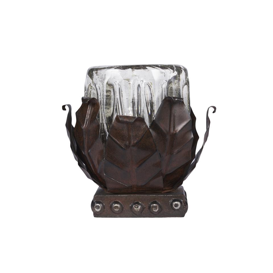Flowering votive, lights a'bloom...forged and cast base with ribbed mouth blown glass.