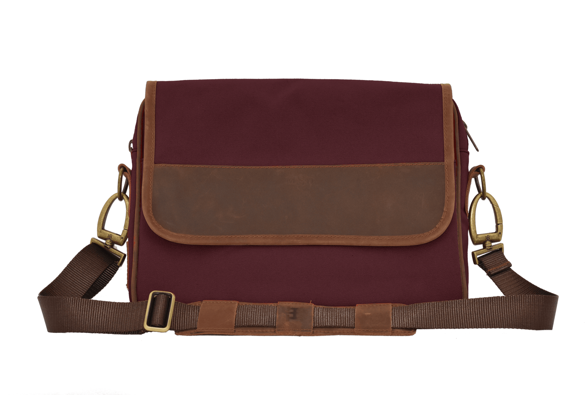 - Magnetic buckle snaps with antique brass hardware and zippered closure underneath