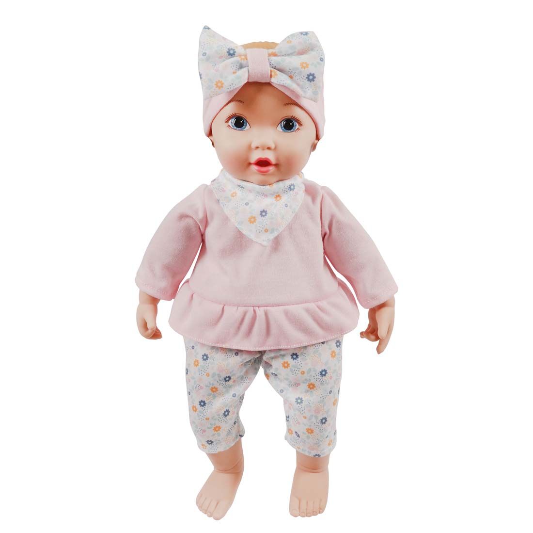 The 13" toddler Hugs and Giggles doll is a delightfully soft doll perfect for joining in on the fun and laughter! This doll can fit her pointer finger or thumb in her mouth to giggle along when playing. She wears a long-sleeve-ruffled pink top, bib, floral pants, and a matching floral bow pink headband.